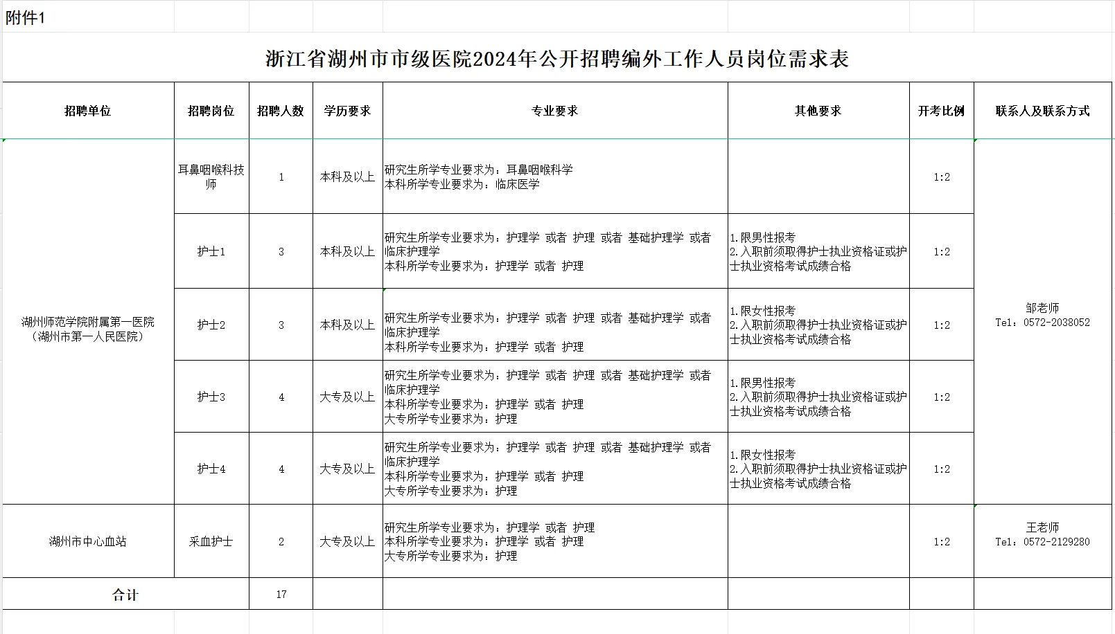 此次计划招聘编外工作人员17名。具体招聘单位、岗位、人数和报考资格条件等详见《浙江省湖州市市级医院2024年公开招聘编外工作人员岗位需求表》(附件1)。