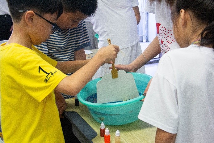 课前,实践团支教组成员提前准备好相关制作材料。实践团成员们向“小蜜蜂”们依次介绍了漆扇的历史、分类、具体制作过程与制作技巧。不仅如此,还手把手地指导孩子们制作漆扇,从挑选扇面到涂绘图案,每一个环节都让“小蜜蜂”们亲身体验了传统手工艺的精湛技艺和独特魅力。“小蜜蜂”们或专注地描绘着心中的图案,或小心翼翼地涂抹着漆料,他们的脸上洋溢着对传统文化的热爱与向往。