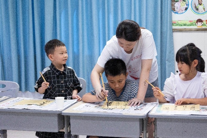 接下来,“小蜜蜂”们穿越时空的长廊,从古老的甲骨文、金文,一路追寻至典雅的小篆、端庄的楷书,再到流畅的行书,深入体会汉字跨越千年的独特魅力。在时间生动有趣的讲解下,“小蜜蜂”们仿佛被带入了一个充满神秘与魅力的汉字王国,他们的眼中闪烁着好奇与兴奋的光芒,深深地沉浸在汉字演变的魅力中。随后,在支教组成员的指导下,“小蜜蜂”们手握毛笔,认真地在宣纸上书写下一个个汉字。从最初的歪歪扭扭到后来的逐渐成型,“小蜜蜂”们不仅感受到了书法的魅力,更体会到了书写的乐趣与成就感。通过“汉字的演变”课堂,有助于孩子们了解到中国书法艺术的悠久历史和深厚底蕴,激发了他们对汉字之美、书法之韵的热爱与尊重。