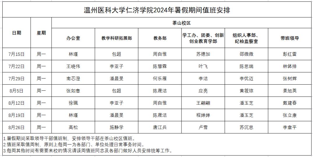 (二)放假期间,原则上每周一上午为各部门处理日常事务时间(值班安排详见下表)。